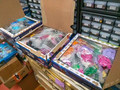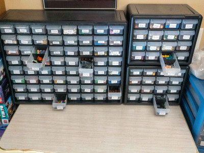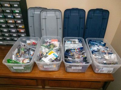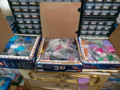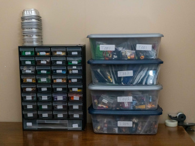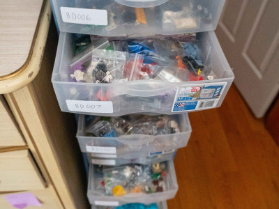 Parts have been either sorted into Akro-Mils drawers; or they have been bagged by lot, and kept in boxes and bins. Minifigures are mostly stored in the bigger drawers and tubs.