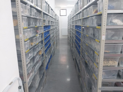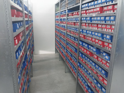 If interested, the shelving system is also available; it's currently stored in approximately 150 square meters of space. There are 60 compartments measuring 1.30m x 60cm and 17 compartments measuring 1m x 60cm for the drawers, with a height of approximately 2.50m. At €25 per compartment, that's just under €2,000 for the 77 compartments. I think we have a total of 100-120 compartments.